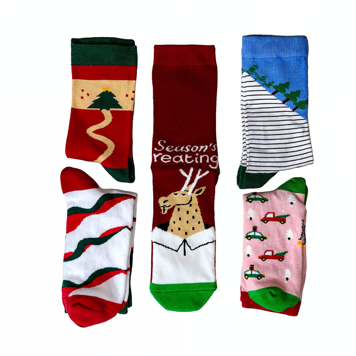 Five pairs of adult socks with unique Christmas-themed designs